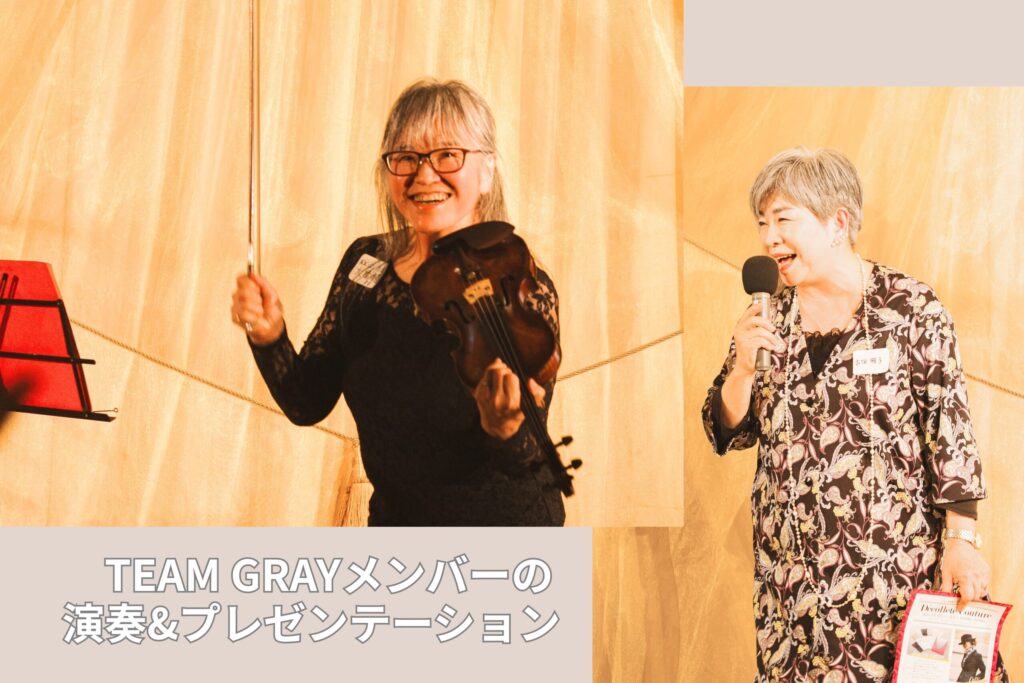 その後、「TEAM GRAY」メンバー古⽥朋⼦さんの「デコルテクチュール」のご紹介、⼤橋理恵さんのバイオリンの演奏にて華を添えていただきました。